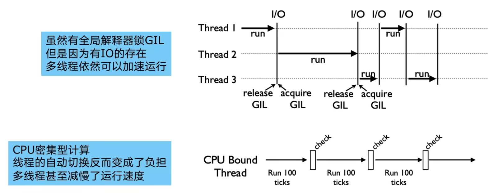 如果遇到CPU密集型计算,多线程反而会降低执行速度!!  multiprocessing模块就是Python为了解决GIL缺陷引入的一个模块,原理是用多进程在多CPU上并行执行。