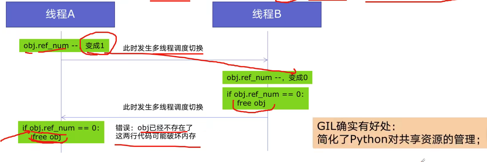 简而言之:Python设计之初,为了规避并发问题引入GIL,现在想去除却去不掉。 原因详解:为了解决多线程之间数据完整性和状态同步问题,Python中对象的管理,是使用引用计数器进行的,引用数为0则释放对象。 开始:线程A和线程B都引用了对象obj,obj.ref_num=2,线程A和B都想撤销对obj的引用