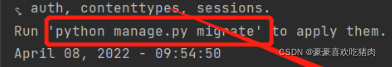 注意:在使用session前需要先读取配置一下django自带的数据库,在每次启动django的时候django都会提示你去配置,去复制一下粘贴到控制台运行一下就好了