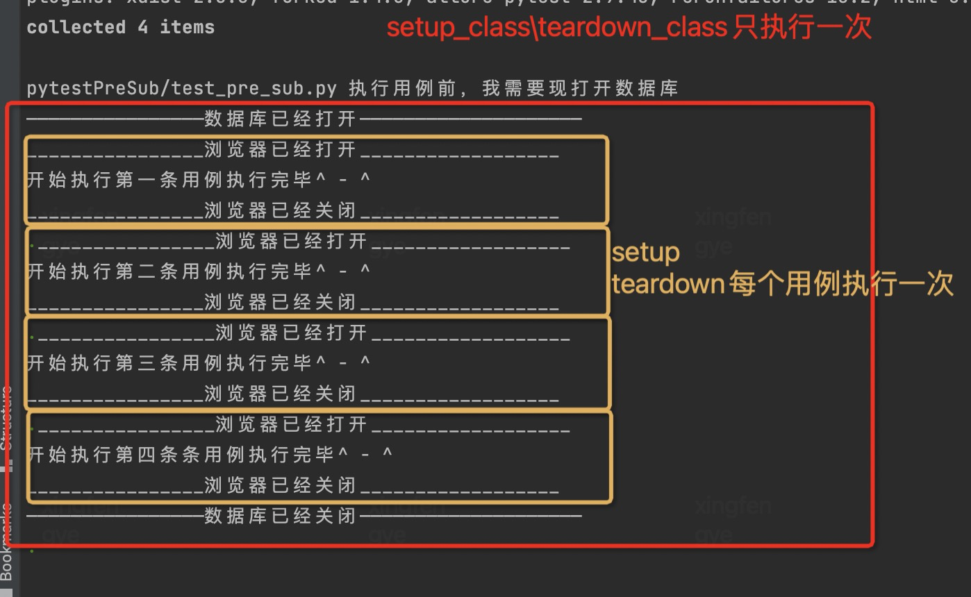 一、setup/teardown,setup_class/teardown_class 几个前后置使用场景: setup_class:在所有用例之前只执行一次 setup:每个用例之前执行一次 teardown:每个用例之后执行一次 teardown_class:所有用例执行完后执行一次 (1)举例场景: 执行用例前,我们需要打开数据库 执行第一个用例第一步,我们需要打开浏览器 执行用例 执行执行完用例,我们需要关闭浏览器