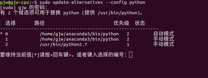 将系统自带的python2.7设置优先级为1 将anaconda3 的pyhton 优先级设置为2