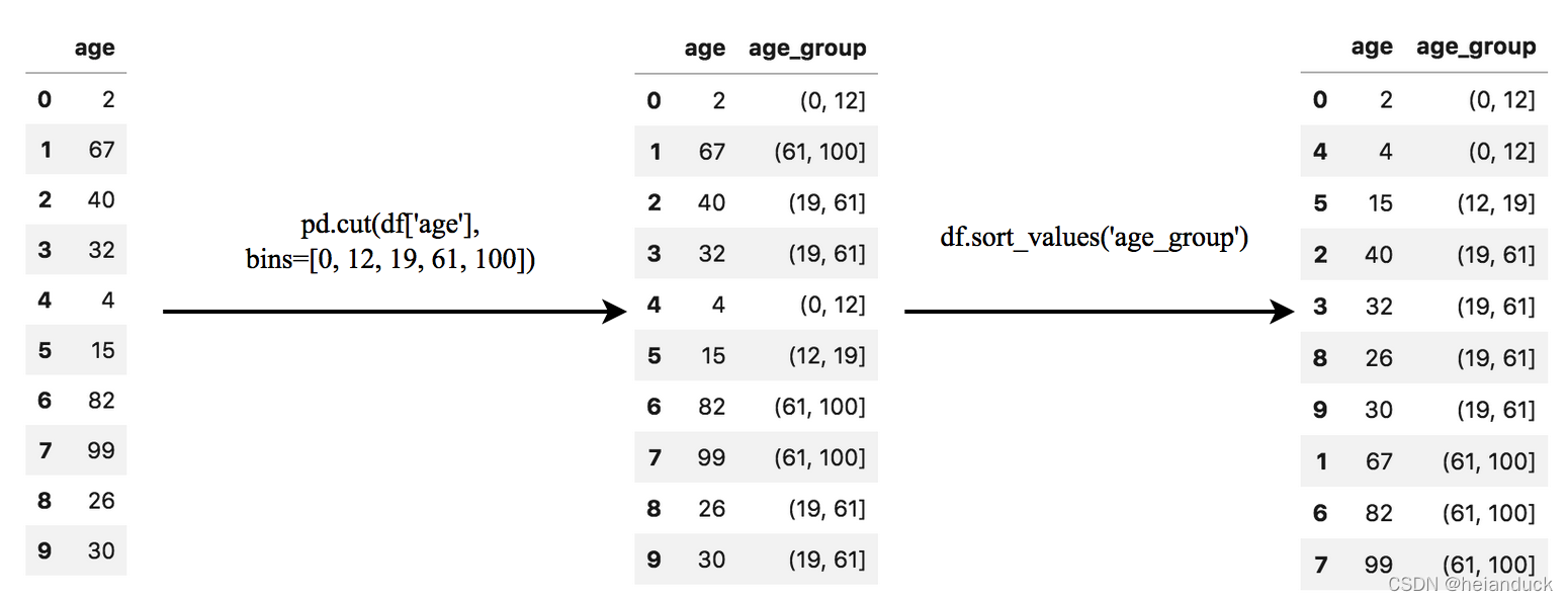 ????????数值数据在数据分析中很常见。 通常,您拥有连续的、非常大的比例或高度偏斜的数值数据。有时,将这些数据分成离散的区间会更容易。 当值被划分为有意义的类别时,这有助于执行描述性统计。例如,我们可以将确切的年龄划分为幼儿、儿童、成人和老年人。 ????????Pandas 内置的 cut() 函数是将数值数据转换为分类数据的好方法。