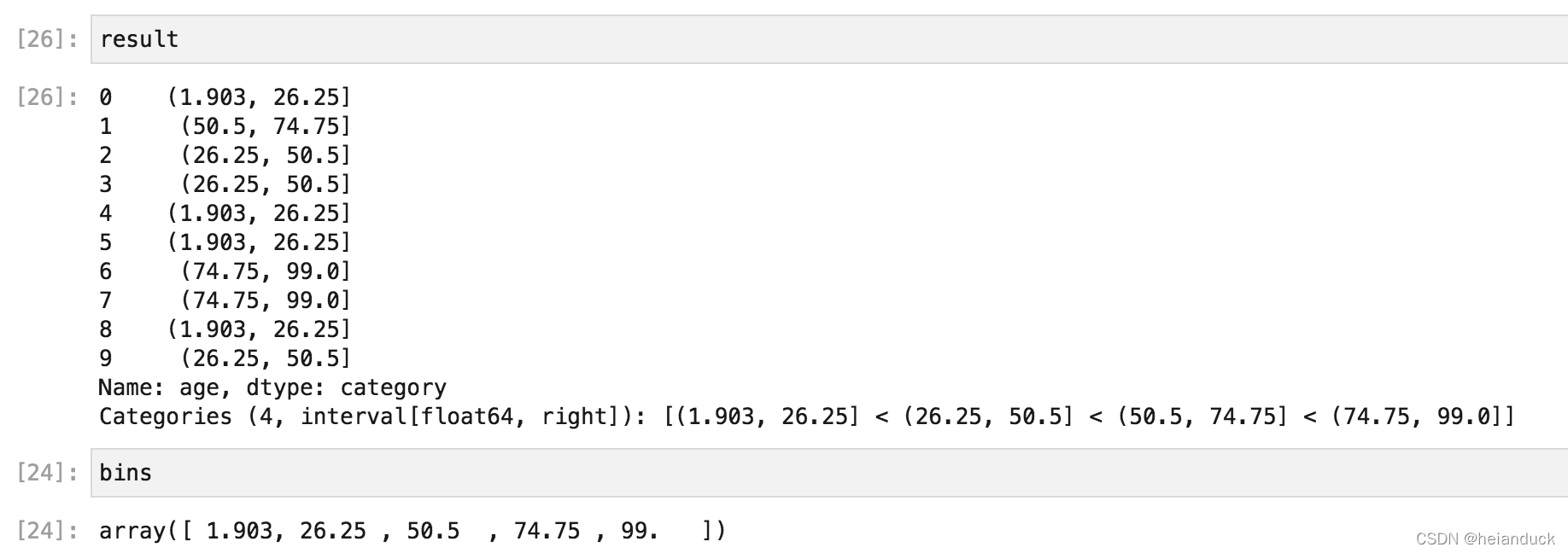 这些区间值的开头有一个圆括号,结尾有一个方括号,例如 (1.903, 34.333]。 这基本上意味着圆括号一侧的任何值都不包含在区间中,而包括方括号的一侧(在数学中称为开闭区间)