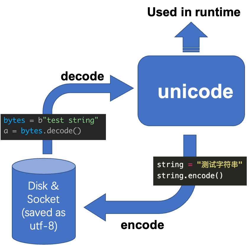 这里需要提一嘴的是,unicode是字符集的编码,而utf-8是unicode的其中一种编码实现(此外还有utf-16等)。然而unicode作为一种能包含100万符号以上的字符集,其编码存在一定的冗余,比如严的 Unicode 是十六进制数4E25,转换成二进制数足足有15位(100111000100101),不利于数据持久化保存和传输,因此需要编码成字节流bytes 进行储存或者网络传输,关于字符编码和字符集的扩展知识可见[1]。如Fig 1.1所示,在python3中称bytes -> unicode 的过程为解码,而unicode -> bytes 的过程为编码,数据类型而言,在python3中的<class 'str'> 其实对应python2的<type 'unicode'> ,python3的<class 'bytes'> 对应python2的<type 'str'> 。对于函数而言,python3的bytes() 对应python2的str() ,python3的str() 对应python2的bytes() 。相对应的,对于python3而言的解码对于python2而言是编码,对于python3而言的编码则是python2的解码。