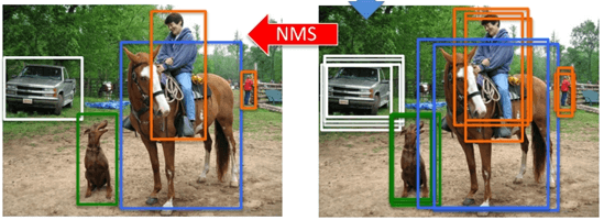 哪个目标物体的中心落在这个网格中,则这个网格负责预测这个目标。 论文中,是将图像分为 7x7 的网格,即上文中的 S=7。如上图所示,红色的点,就是负责检测狗的。 YOLO v1的检测步骤: 1)resize图片尺寸:即是把输入图片的不同尺寸输入到统一的网络结构中去,需要resize到相同的尺寸 2)输入网络出结果 3)NMS NMS,即非极大值抑制,就是将一些冗余框去掉,示意图如下: