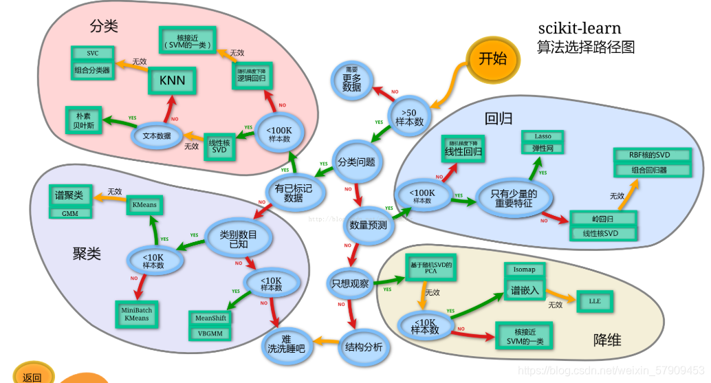 1、样本的数量 2、是否是分类问题 3、是否有已标记的数据 4、如果是分类问题,类别数目是否已知 5、是否是数量预测问题 6、数据是否只有少量的重要特征 7、是否要做结构分析