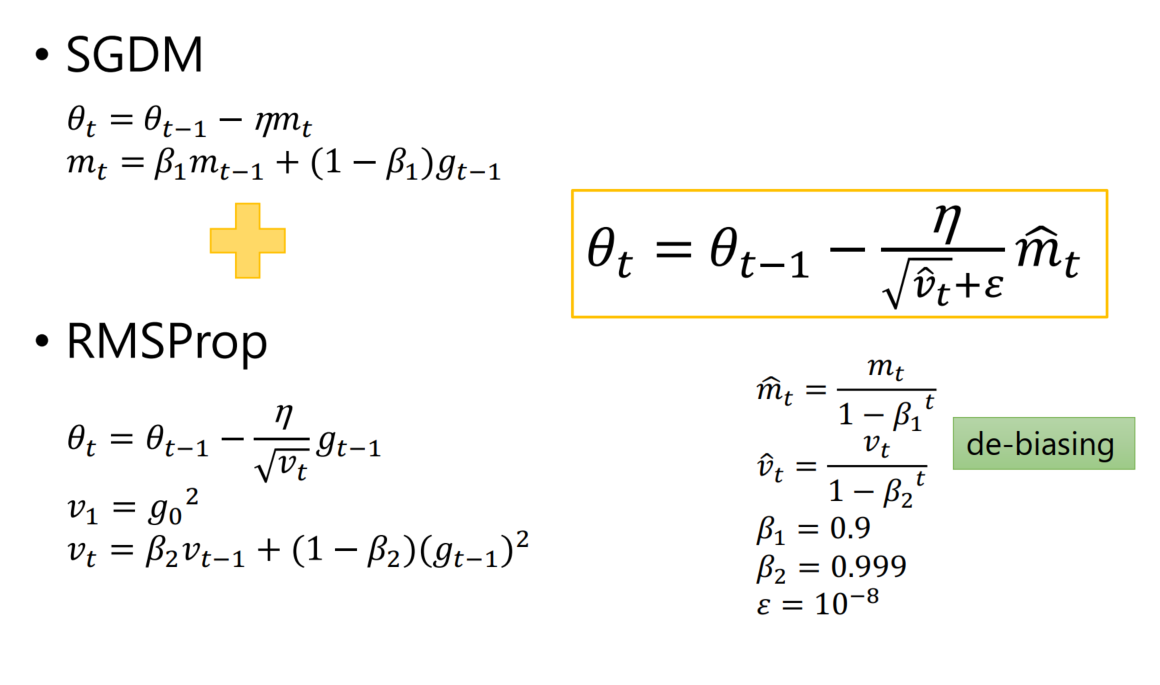 \theta_{t}=\theta_{t-1}-\frac{\eta}{\sqrt{\hat{v}_{t}}+\varepsilon} \hat{m}_{t}