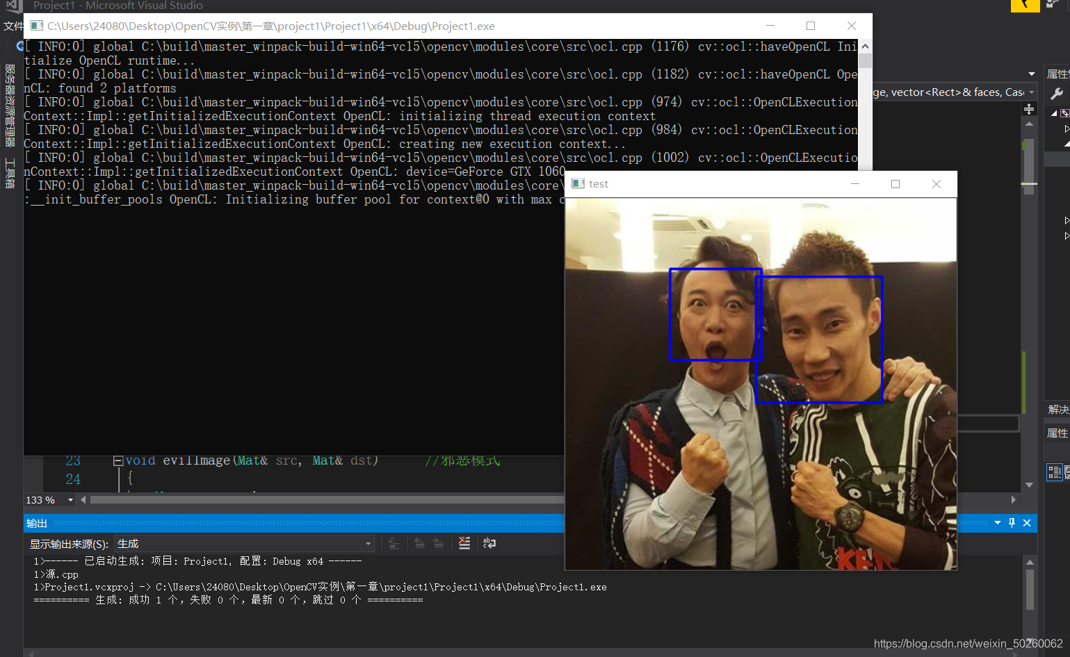 这里注意最后一个语句的倒数第二第三参数,金字塔尺度因子和临近点数量。金字塔尺度因子用于创建图像金字塔,检测器将在其中查找人脸,在生成图像金字塔的每一步中,图像按此比例因子缩小,因此较小的因子(接近1.0)将导致生成更多的图像,但是却意味着更长的运行时间,结果更精准,第二个参数控制了邻近人脸的下限,若检测出至少三个相邻的人脸整个分类器只返回一个人脸。