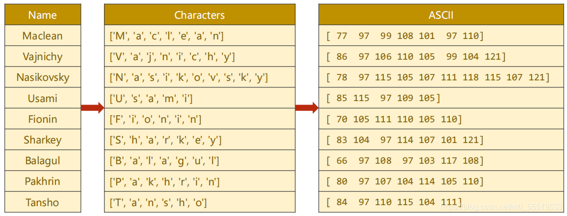 1.Name转成序列List,即Maclean→['M', 'a', 'c', 'l', 'e', 'a', 'n']