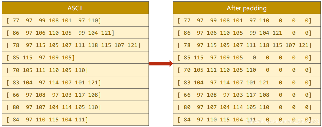 3.Padding将一个batch_size的序列填充成长度相同,即[77 97 99 108 101 97 110 0 0 0]