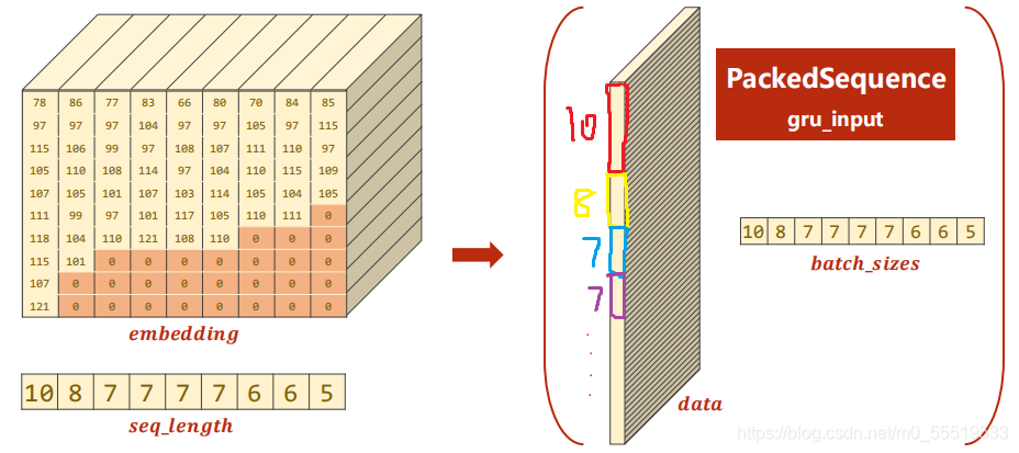 ?随后通过rnn.pack_padded_sequence(embadding, seq_lengths)对非零的值进行打包