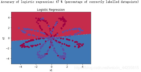 在构建完整的神经网络之前,先看看逻辑回归在这个问题上的表现。可以使用sklearn的内置函数来实现这一点。运行下面的代码在数据集上训练逻辑回归分类器。