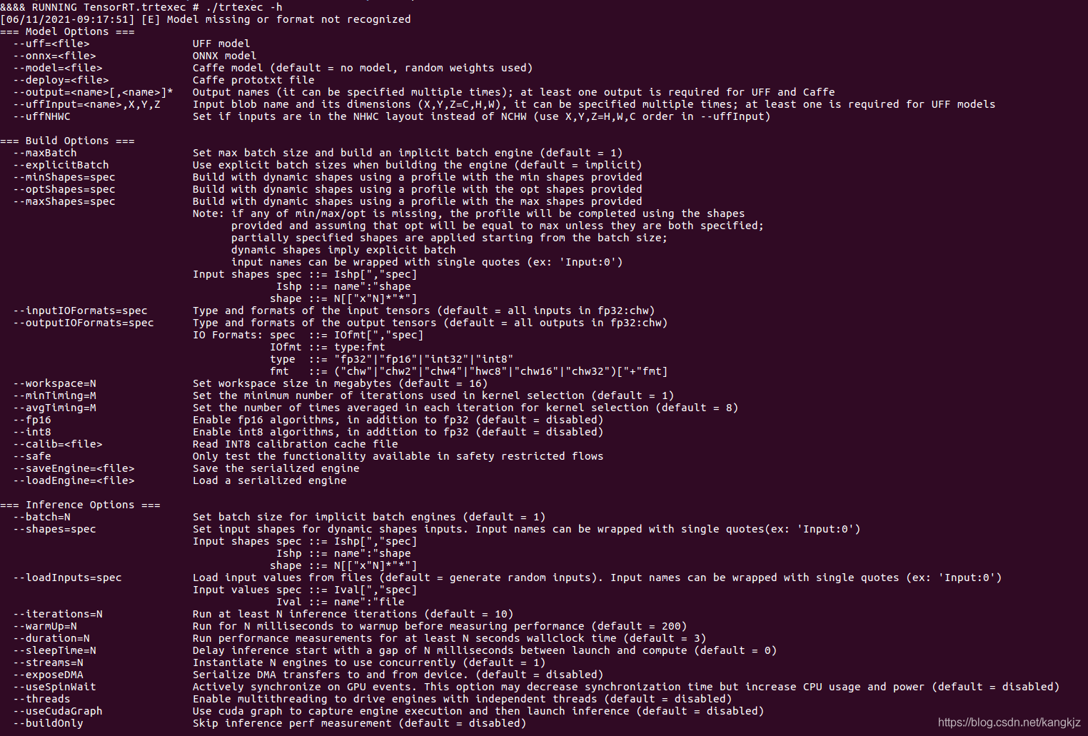 其中给出了 model options、build options、 inference options和system options等。 上次我们使用TensorRT的pyhton API进行序列化模型和前向推理,这次介绍使用trtexec转模型。