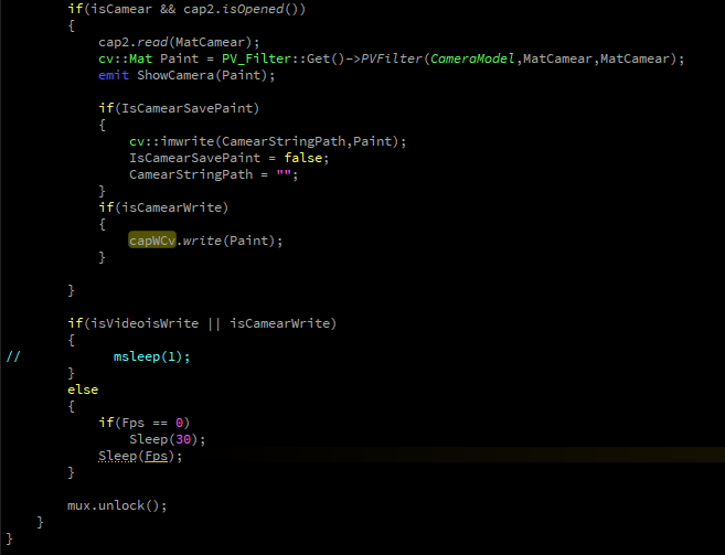 打开视频 获取FPS是为了在run中Sleep SwitchPlayIcon是为了切换播放的图标显示  视频录制 因为视频录制需要VideoWriter先调用open open需要获取的几个值 路径 fourcc Fps 长宽 以及是否是彩图或灰度图  停止录制  run内部循环的一些视频处理 这边的逻辑是 如果暂停那就停止读取下一帧Mat 如果是Read不到下一帧 那可能是视频播放完毕 处于录制状态要停止录制 如果处于保存一帧图片的情况就用imwrite处理就好 如果是处于录制状态 则需要知道他的开始位置跟结束位置(ui有一个开始跟停止的Slider) 如果存在开始就调到开始 跟计算结束的位置停止录制就好