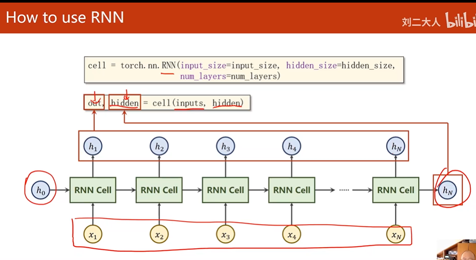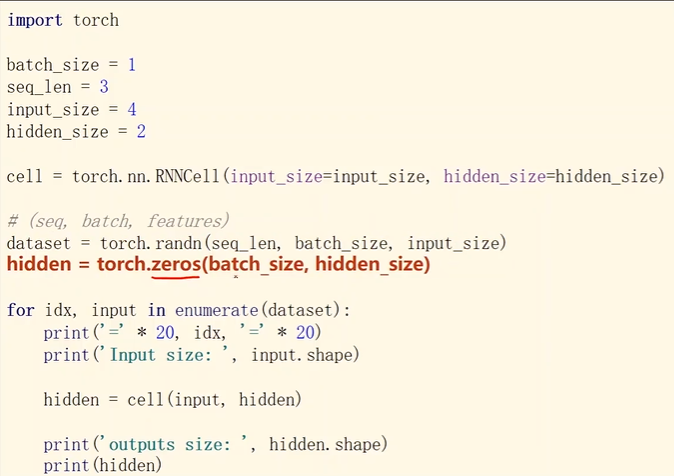 确定一个RNN cell需要两个值  如何使用RNNcell   如何使用RNN 使用RNN就不用自己写循环了    使用numlayer    例子  step1 构造一个词典,构造一个向量(词典多少个,向量就多少维(列)),将这个向量作为输入(input_size = 4)