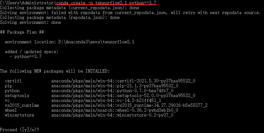 安装虚拟环境 利用conda create 命令创建tensorflow2.1虚拟环境: 具体命令:conda create -n tensorflow2.1 python==3.7