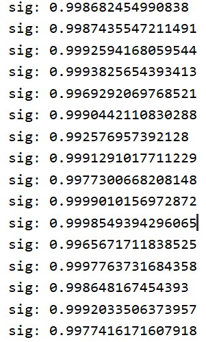 输入层和隐层神经元的数量的增加从结果上来看并没有很大程度上改善结果的输出,于是我打印了一下第一个隐层经过sigmoid(x)函数之后的结果: