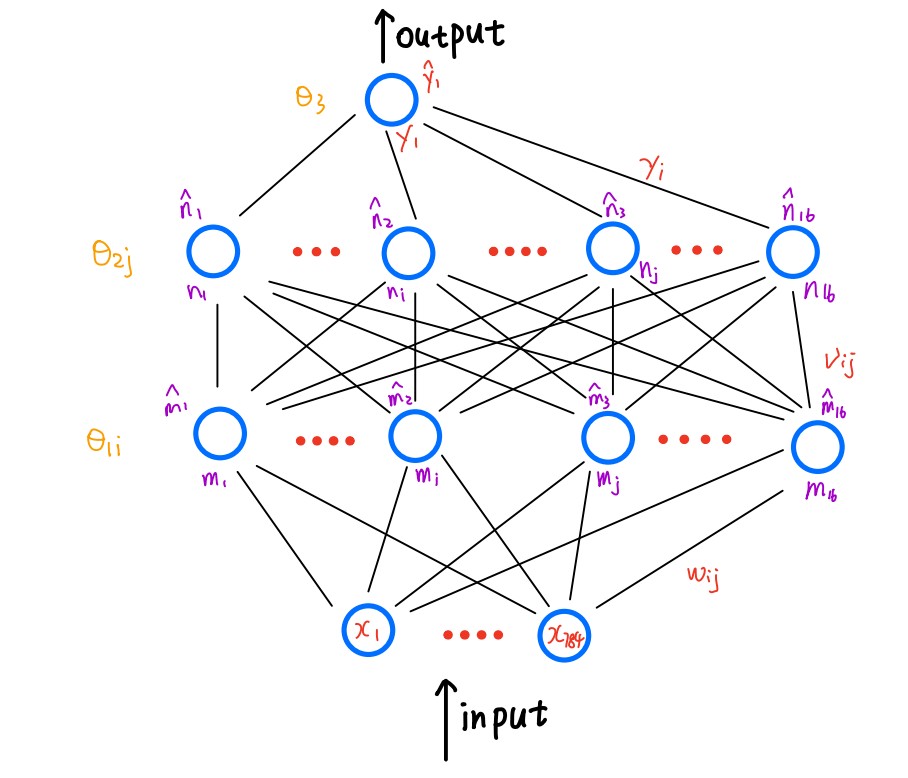 我将神经网络改成了输入神经元是784个,也就是说图像上的每一个像素点都最为神经网络的输入,而且我把神经网络的2个隐层里的神经元都设置为了16个,图示如下图所示:
