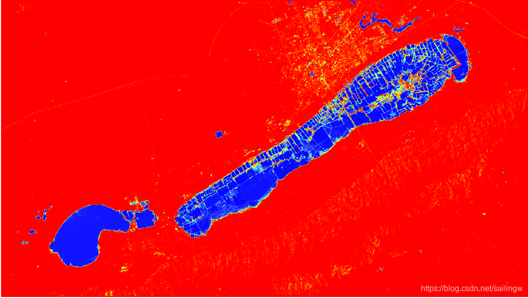 3、水体提取结果:从红色到蓝色(从0-1),是水体的可能性逐步增加。