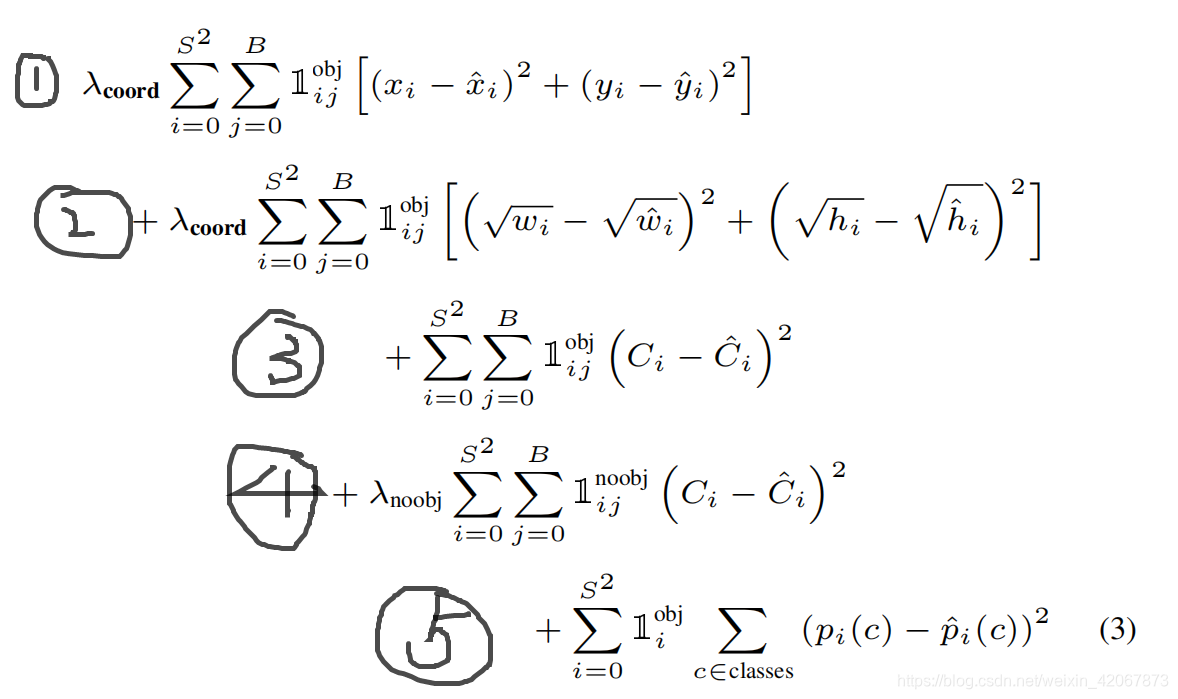 - 如下① ②部分是和坐标宽高有关系的式子,所以仅在有预测目标存在的情况下才会对损失函数有影响