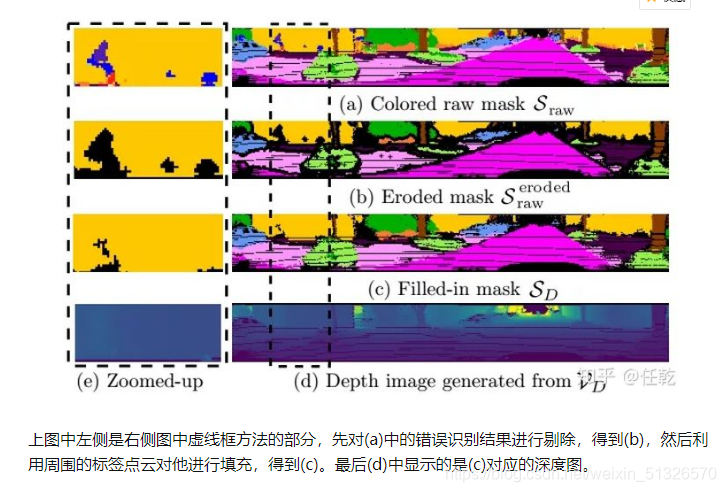 上图中左侧是右侧图中虚线框方法的部分,先对(a)中的错误识别结果进行剔除,得到(b),然后利用周围的标签点云对他进行填充,得到(c)。最后(d)中显示的是(c)对应的深度图。