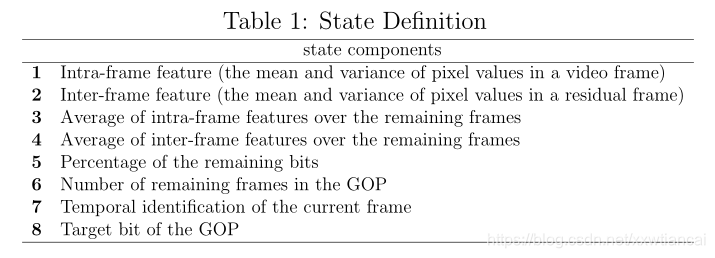 ? ? ? 这些状态信息中包含了一些帧内的和帧间的特征,这些特征描绘了GOP和residual frames中的统计信息。状态依赖于一个GOP中剩余视频帧的统计这一事实表明了一种前瞻策略。也即当参考帧还没有被编码时,使用其原始和未压缩版本来计算剩余帧。