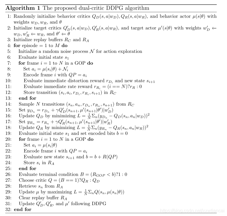 ? ? ? ?学习两个critics,一个用于预测失真奖励,一个用于预测码率回报。Agent会自适应的根据其中一个critic进行更新。不断在训练中将agent应用于编码一个GOP,如果产生了超过了RGOP的比特率,就是用rate critic QR 去更新它的网络参数。目的是优化代理以实现精确的速率控制。另一方面,当实际的比特率低于目标比特率时,则会更新QD去最小化重建GOP的失真。具体算法如下: