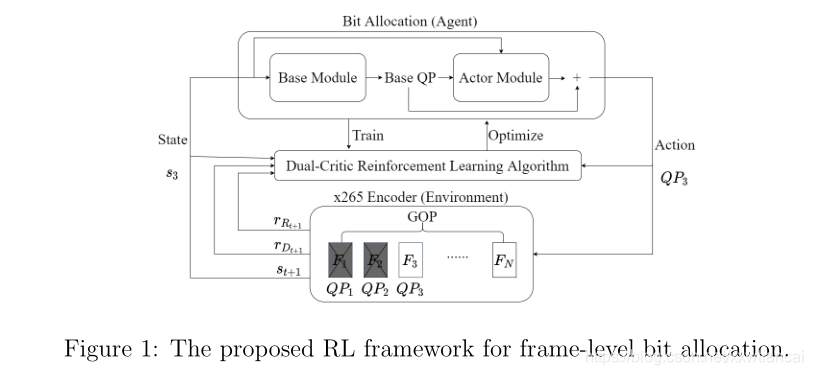 - 基于所选择的QP,当前帧由指定的编解码器(例如x265)编码和解码,以更新状态信号,供代理决定下一视频帧的QP。此外,两种不同的类型的奖励(即失真和码率奖励)计算出来用来指示所选QP的好坏(第2.3节)。这些步骤重复迭代,直到达到最终状态(即一个episode)。训练让代理与编解码器多次交互,以便它可以学习最大化回报(第2.4节)。