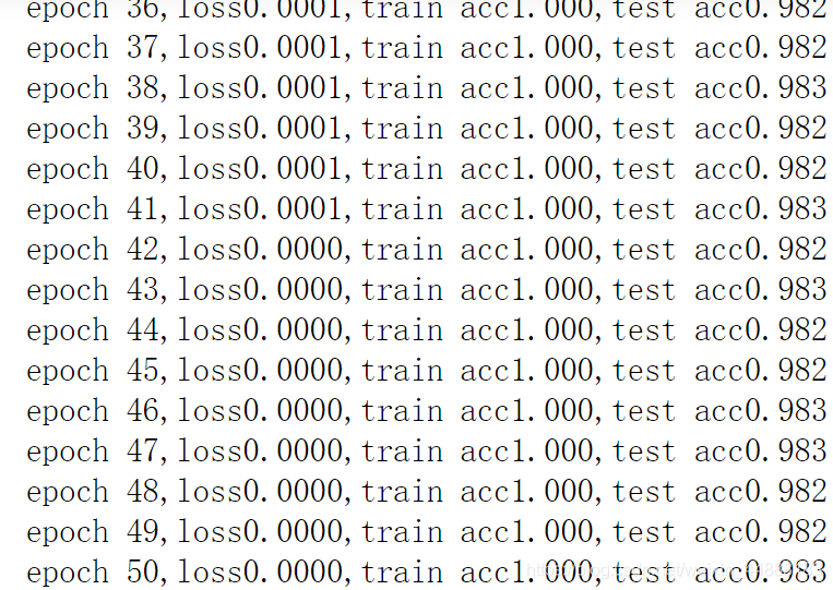 print('epoch %d,loss%.4f,train acc%.3f,test acc%.3f'