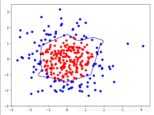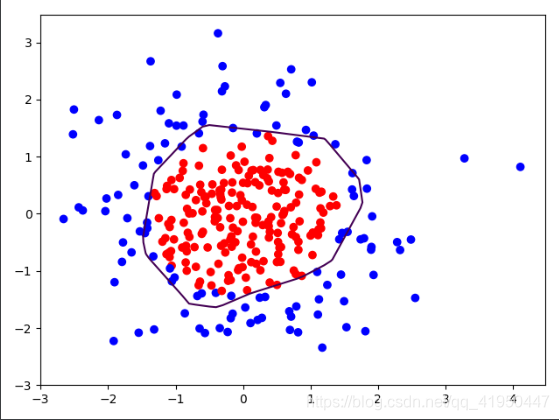 # 把坐标xx yy和对应的值probs放入contour函数,给probs值为0.5的所有点上色 plt.show()后 显示的是红蓝点的分界线