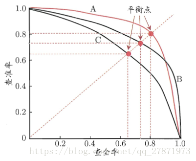 3,性能度量 (1)查准率precision,查全率recall TP:正确地标记为正,即算法预测它为好西瓜,这个西瓜真实情况也是好西瓜(双重肯定是肯定); FP:错误地标记为正,即算法预测它是好西瓜,但这个西瓜真实情况是坏西瓜; FN:错误地标记为负,即算法预测为坏西瓜,(F算法预测的不对)但这个西瓜真实情况是好西瓜(双重否定也是肯定); TN:正确地标记为负,即算法标记为坏西瓜,(T算法预测的正确)这个西瓜真实情况是坏西瓜。  (2)二者的关系(矛盾) P-R曲线  性能:A>B>C