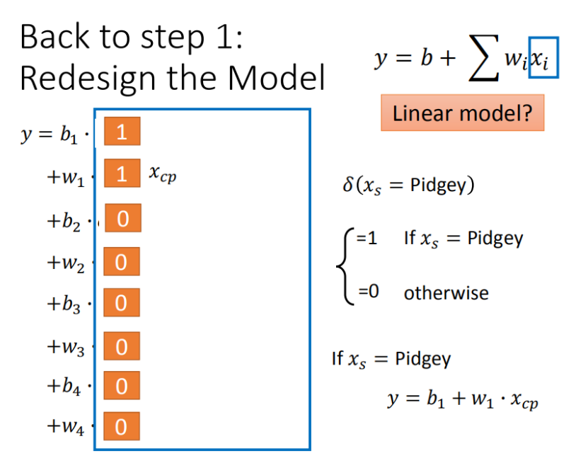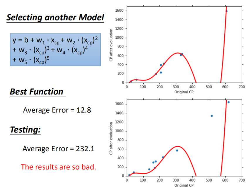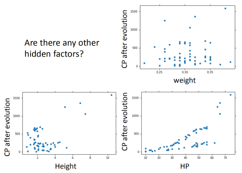 当选用一元N次模型时,训练的average error和测试的average error看似都变得更小。但是还要注意一个问题,当我们继续增加幂的次数后,将会出现过拟合问题。如下图   当特征量x不再唯一时,如下图  不同颜色小点,分别表示不同的物种。宝可梦的物种 不同,将对应不同的function。   当我们学过信号与系统,将会很容易理解这个式子。假如当输入的xs(表示宝可梦物种)为喷火龙时,那么只有喷火龙的参数有效,其余都为0,这样我们就可以对不同物种进行预测了。  但是我们的特征参数不止一个,当引入参数过多时我们仍然可能导致结果过拟合。