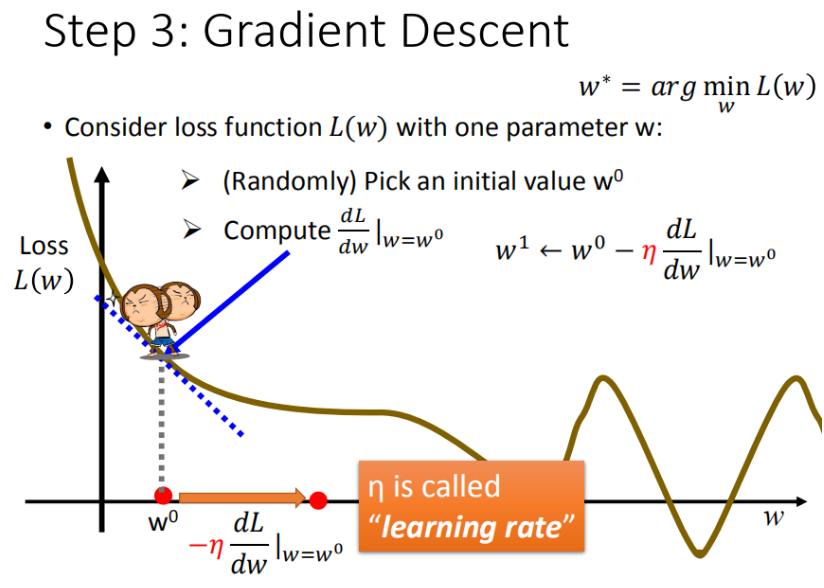 梯度下降的作用是优化参数w和b。 当只有一个参数w时:  η:我们可以称为“步长”,或者learning rate。 由图可知,当w的偏导小于0时,w的值向右移动;当w的偏导大于0时,w的值向左移动,直到不能移动为止,但是好像那不是最小值!还好,在线性模型中我们不会遇到这个问题。 当有两个的参数的情况:    每一条线围成的圈就是等高线,代表损失函数的值,颜色约深的区域代表的损失函数越小 红色的箭头代表等高线的法线方向