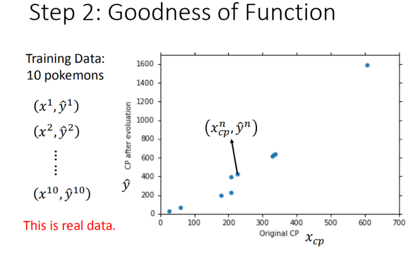 首先,b和w都是未知数,所以在这个函数集合中,包含了成千上万个函数,那么我们怎么知道一个function是好是坏呢?没错,就是损失函数(loss function) 下面这个图是10组training data,this is real data  xcp:进化前的cp值 y:进化后的cp值  这就是损失函数的例子,我们可以很容易看出,这是一个最小二乘法的式子。当损失函数越小,说明模型就越好。input:a function,output:how bad it is。