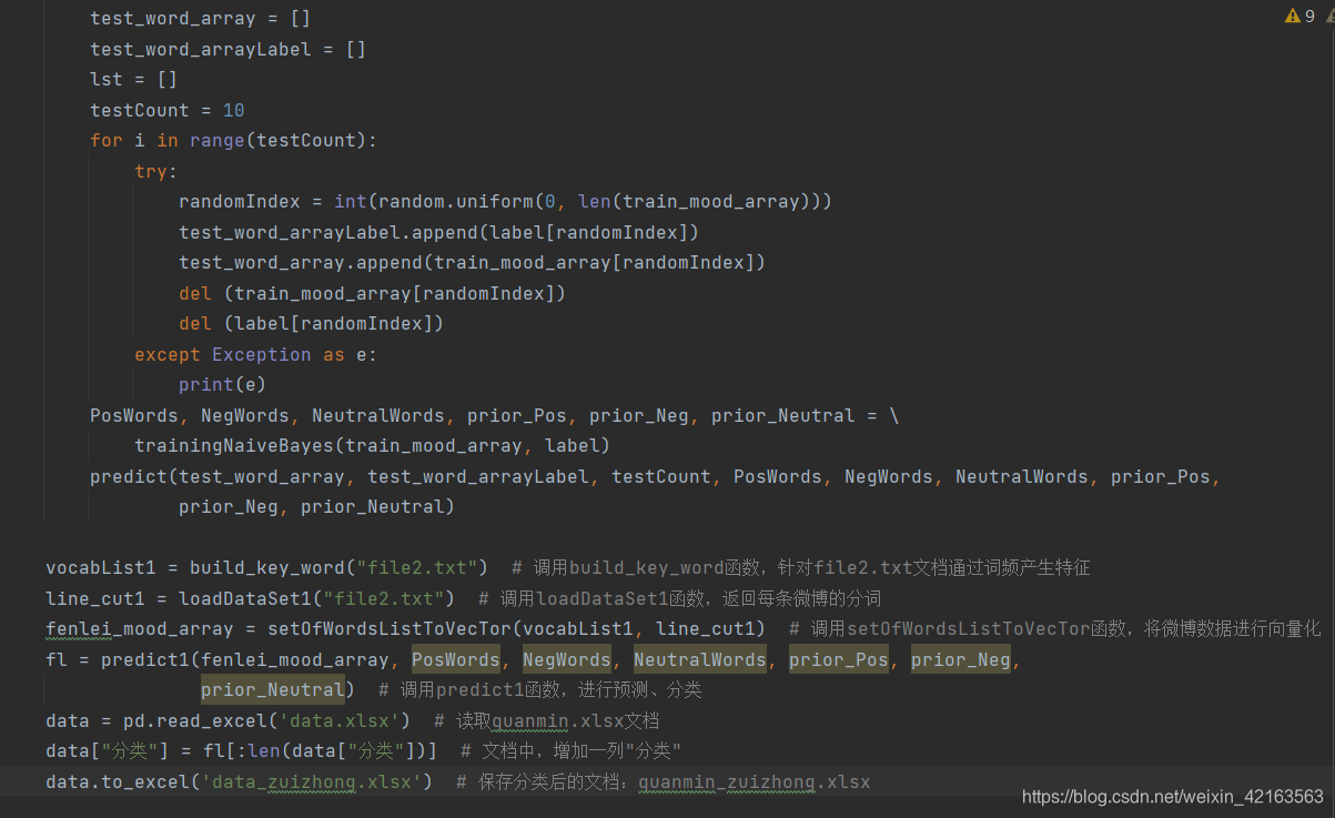 本文中将微博的情感分为三类,分别用数字代表某一类结果,其中1表示积极,2表示消极,3表示客观。经过之前的去标签、分词和向量化之后,样本均变成了numpy中的数组,下面将使用多项式朴素贝叶斯进行训练。其伪代码如下图所示。