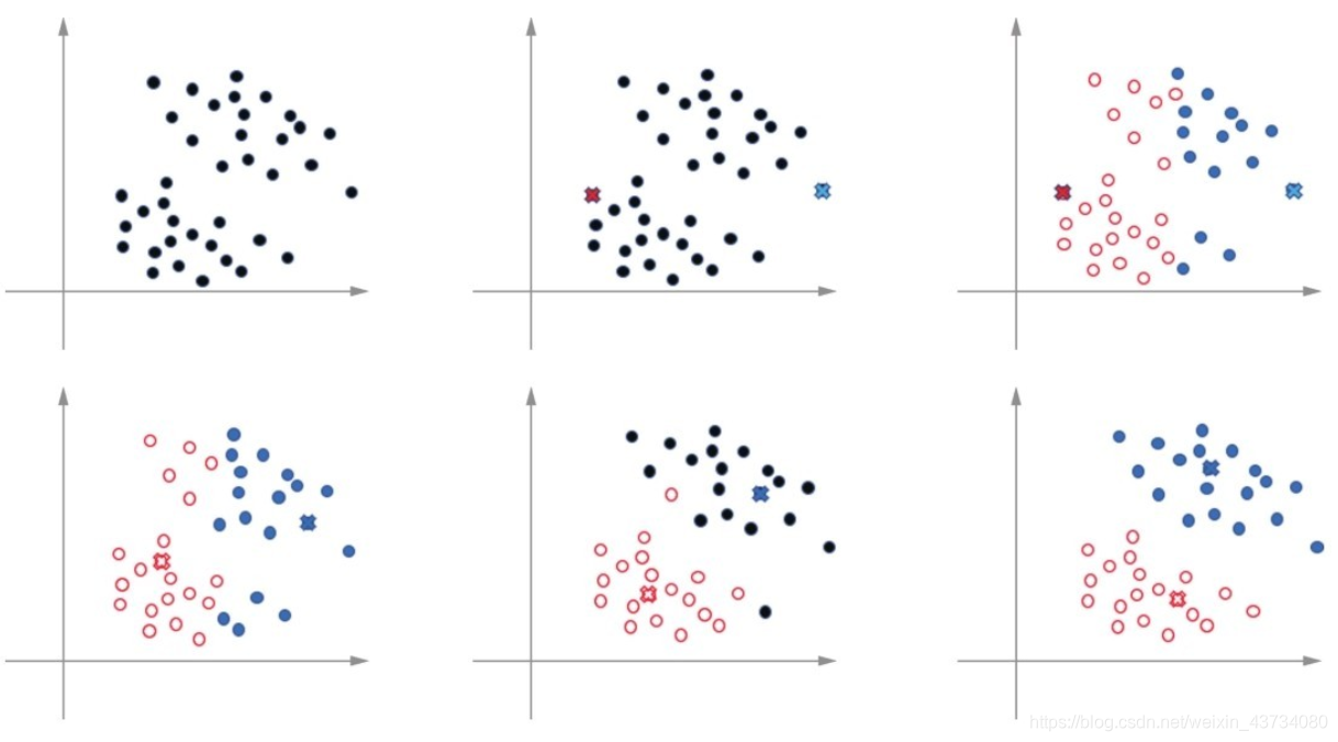 (7)一直重复进行步骤(5)和(6),不断更新簇中的数据点,不断找到新的质心,直至收敛。