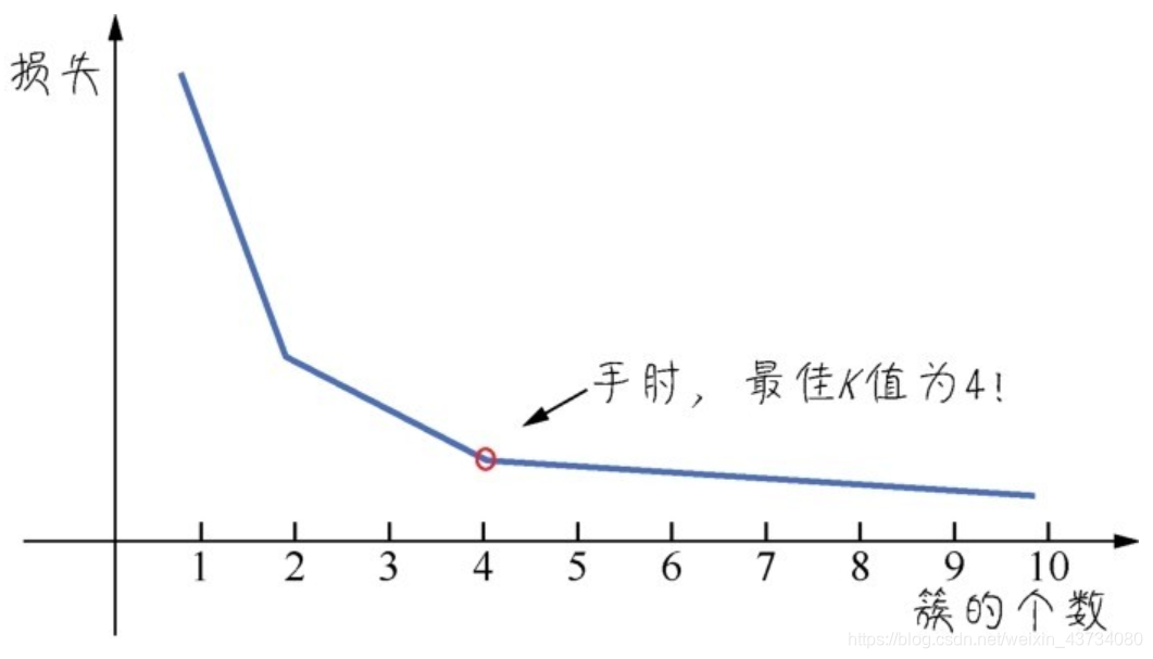 大家看下面的图,损失随着簇的个数而收敛的曲线有点像只手臂,最佳K值的点像是手肘,因此取名为手肘法。