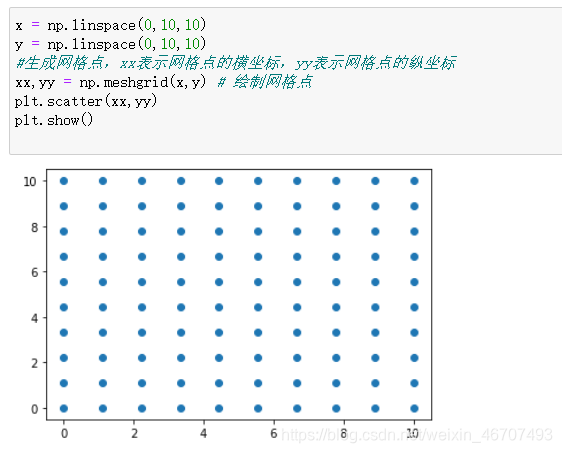 可通过np.meshgrid(x,y)函数生成网格点坐标,函数返回网格点的横坐标和纵坐标的两个数组