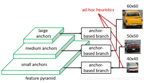 在介绍FSAF前先说一下在带有FPN的检测器中是如何分配ground truth的,如下图Fig1所示,一个大小为50×50像素的汽车实例可能和小的anchor有好的重合所以将其分配给了small anchors这层,同理这个40×40像素的汽车也分配到了这层,但是,另一个60×60像素的汽车与其他两个有着相似的特征但是却分配到了medium anchors层。这就说明anchor匹配机制其本质上就是一种人为的启发式特征选择。这导致一个主要缺陷,即用于训练每个实例的所选特征层可能不是最佳的。