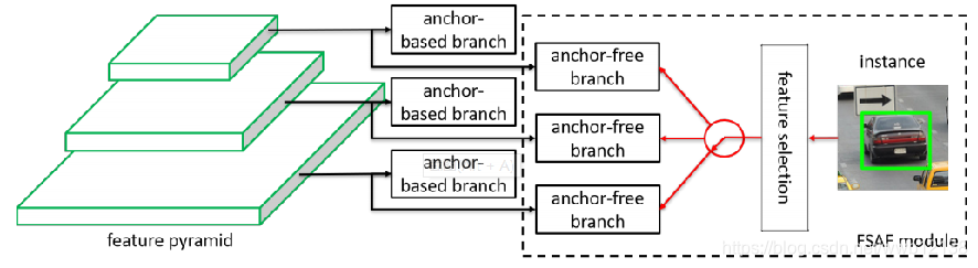 为了解决上述问题,作者提出了一种简单有效的FSAF模块,如下图Fig2所示,这样做的目的就是让每个实例可以自己去选择最好的特征层来优化网络,采用这样的方法就不再需要anchor来进行约束,而是采用anchor free的方式来对实例进行编码。每个层的特征金字塔都构建一个anchor free的分支,其独立于anchor based的分支。