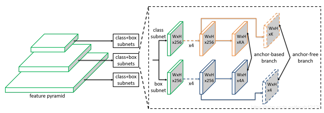 下图Fig3中虚线部分为FSAF模块,其中每一个特征层,都会被用来检测不同尺度的物体,每个特征层都包含两个并行的子网络。其中W×H×K(K为分类数)的特征图用来进行分类(这里使用的是signoid函数),W×H×4的特征图用来进行回归(这里使用relu函数)。