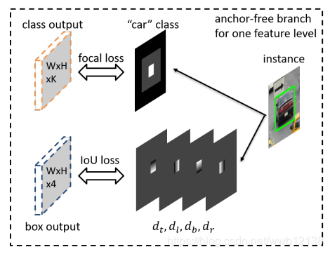 下图Fig4为FSAF模块中的classification和regression两个分支,对于一个实例其bounding box为b=[x, y, w, h],将其映射到特征层 上的坐标为 ,文中定义了一个有效区域 ?= 文中设置 =0.2,和忽略区域 ?=? ,文中设置 =0.5。 = , = , = , = , = , = , = , = 。图中的白色区域为有效区域在训练中为正例区域内会填充1,灰色区域为忽略区域在训练中不参与梯度回传,黑色区域为负例在训练中区域内会填充0。文中选用focal_loss作为分类分支的损失函数。对于回归分支,回归输出的是与类别无关的4个偏移量映射。对于有效区域中的任一像素点(x,y),生成一个四维向量,分别代表到有效区域上,左,下,右,边的距离。该分支采用IOULoss。