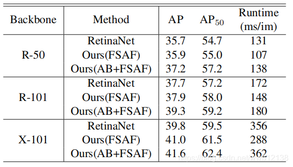?2)根据下图Fig7发现在不同的backbone中单独使用FSAF模块虽然在AP上提升很小但是却在速度上有很大的提升。
