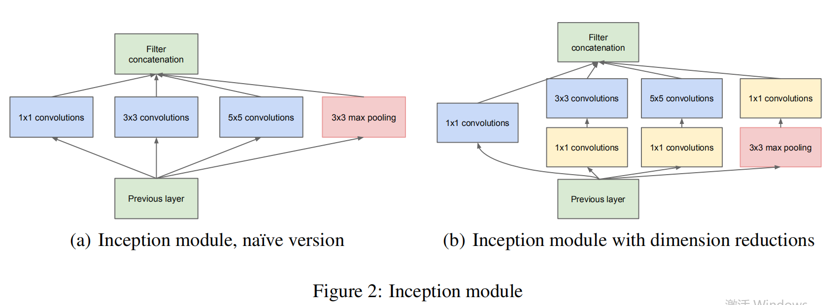 Inception结构如下图所示,左图是原始版本,右图是降维版本: