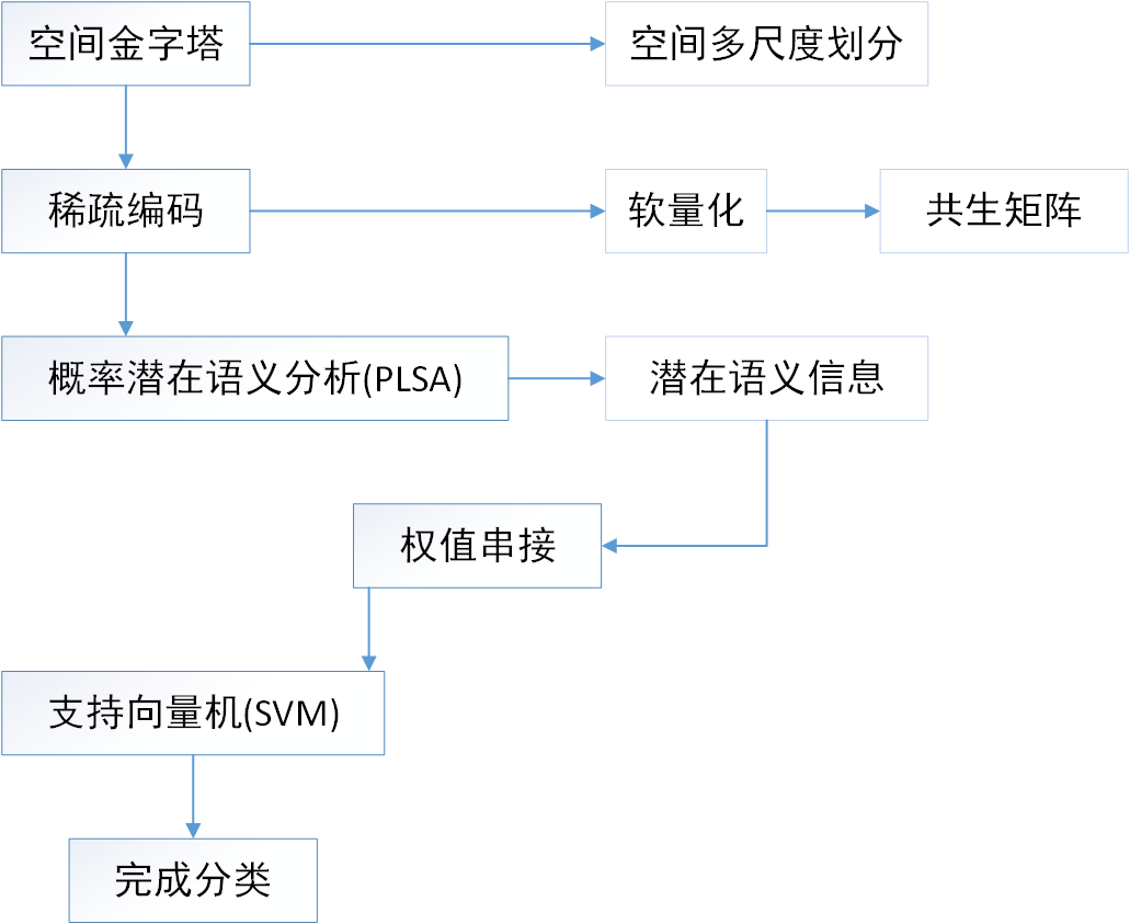 从摘要中可知该文章所提出的稀疏编码多尺度空间潜在语义分析算法主要用到的模块主要有:空间金字塔,稀疏编码、概率潜在语义分析(PLSA)、支持向量机(SVM)。