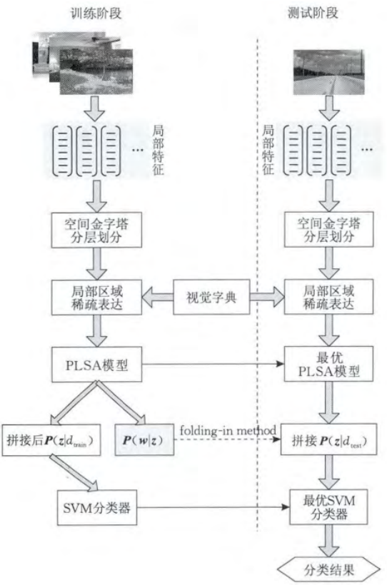 3、图像多尺度空间潜在语义学习模型 以一个3层空间金字塔分块模型为例,第0层表示是原图像,第1层对图像进行2×2分块划分,第2层对图像进行4×4分块划分,则一共可以得到21个图像区域,如图:  4、训练和测试阶段 下图为基于稀疏编码多尺度空间潜在语义分析的图像分类的总体框架示意图.系统主要分为两个阶段:训练阶段和测试阶段。在训练阶段,通过本文提出的图像多尺度空间潜在语义模型学习得到最优的 PLSA模型,再结合该模型生成的图像多尺度空间潜在语义特征来训练SVM分类器模型,从而得到最优的SVM分类器模型.在测试阶段,首先结合训练阶段得到的最优PLSA模型参数P(w|z)及测试图像的每个局部区域软量化形成的共生矩阵,使用folding-in方法来计算测试图像的空间潜在语义信息分布,再联合训练阶段生成的最优SVM对该潜在语义信息分布向量进行分类,并将所得的置信度最高的语义类别作为该测试图像的类别标签从而实现测试图像分类。