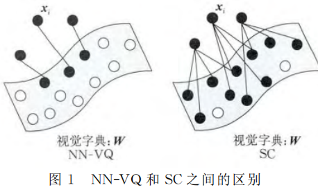 1、NN-VQ → SC SC利用了更多视觉字典中的基来表示特征描述子,而NN-VQ方法只选择1个基来表示局部特征描述子。本文采用SC方法取代原先的NN-VQ方法来进行量化形成共生矩阵,使 得生成的共生矩阵具有较小的重构误差。  2、本文借鉴PLSA主题模型在文本分析中的一些优良特性来对图像进行分析,将该模型用于图像局部区域潜在语义挖掘,使其获得的潜在语义特征具有较小的冗余性和歧义性。