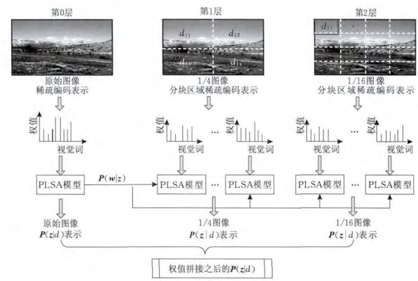 图像分类方法主要可分为两类:基于全局特征、基于中层语义信息。 本文中指出基于图像的底层特征无法解决图像分类中的“语义鸿沟”问题,,即底层视觉特征和高层语义特征之间的不统一性。该问题即是底层特征难以捕捉重要特征,影响结果的正确率;并且全局特征存在的最显著的问题是特征无重点,数据量相对较大,占用资源严重;难以抓住有用信息。本文通过空间金字塔思想对图像进行空间分层和局部区域分块划分获得图像的局部块之间的空间关系,接着利用SC每个局部块进行软量化形成共生矩阵,再结合PLSA模型对每个局部块进行潜在语义挖掘以获得其潜在语义信息分布。最后通过权值将不同尺度上汇总的潜在语义信息进行串接得到图像最终的特征描述。画做图像可表示为: