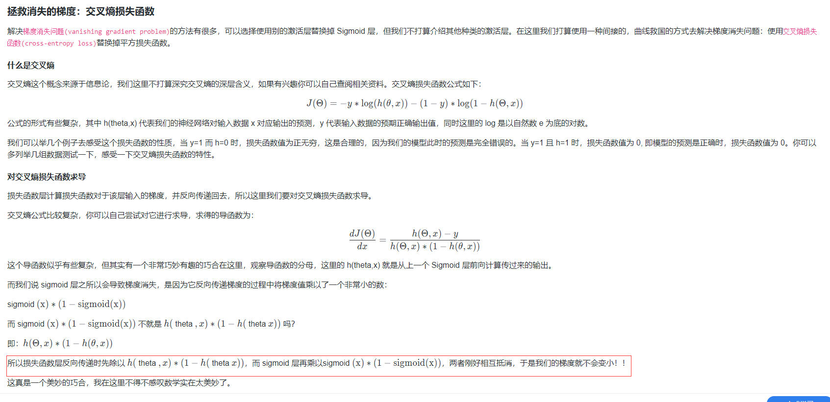 J(θ)=?m1?(ylog(hθ?(x))+(1?y)log(1?hθ?(x))) 至于原因,涉及较为复杂的数学知识。大概是因为交叉熵函数的导数 * 激活层sigmoid的导数可以刚好抵消掉sigmoid(x)*(1-sigmoid(x))这一部分计算。从而解决深度学习中梯度消失的问题。