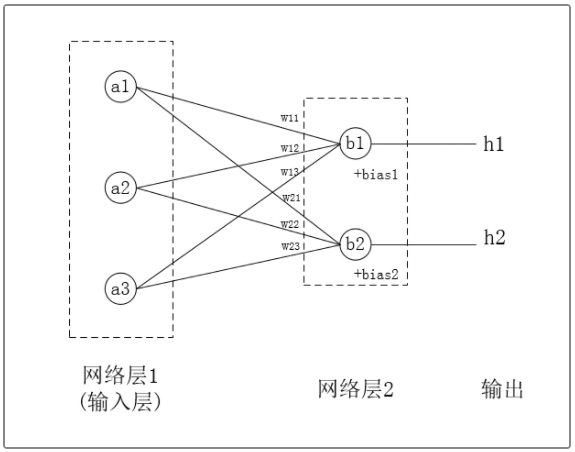 神经网络结构如下:  这是一个两层的简单神经网络结构。一个圆圈称谓神经元。a1 ~ a3为网络层1,b1 ~ b2为网络层2。神经元之间通过直线相连,并有权重w。